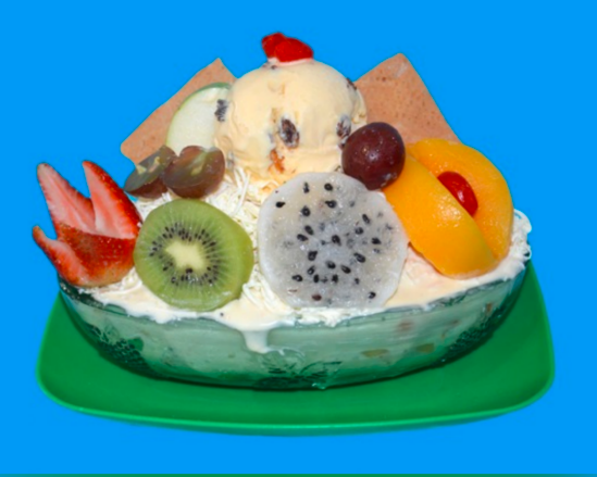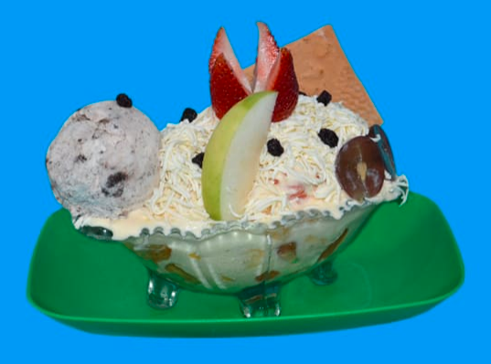 Mango, banano, fresa, papaya, melón, manzana, crema de leche, queso, helado, uvas pasas y galleta.