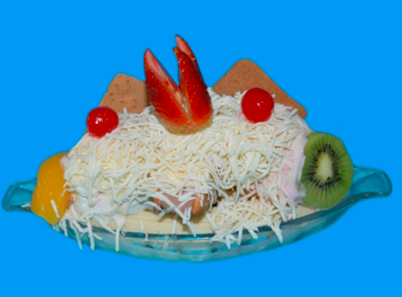 Banana con crema de leche, queso, medio platillo de helado, dos bolas de helado, kiwi, durazno, cerezas y galleta.