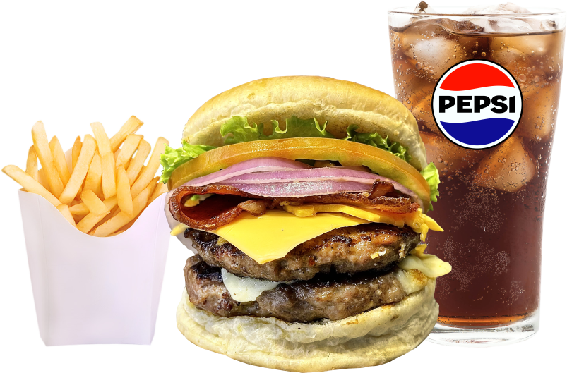 Hamburguesa doble carne, queso blanco y queso cheddar, tomate, cebolla roja, tocineta, lechuga, incluye papas a la francesa y bebida (según disponibilidad).