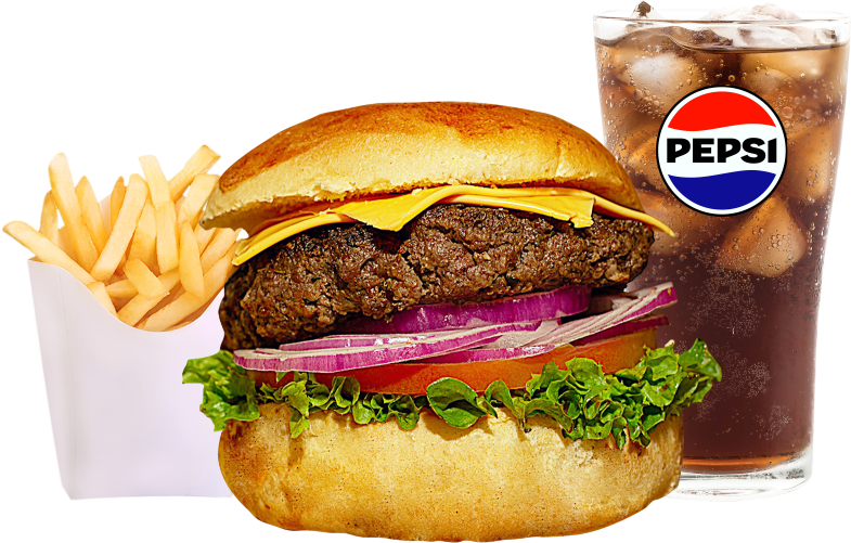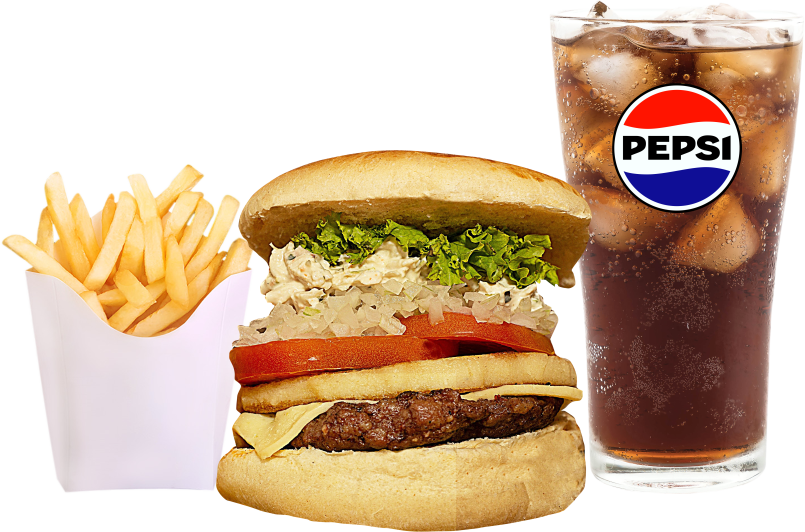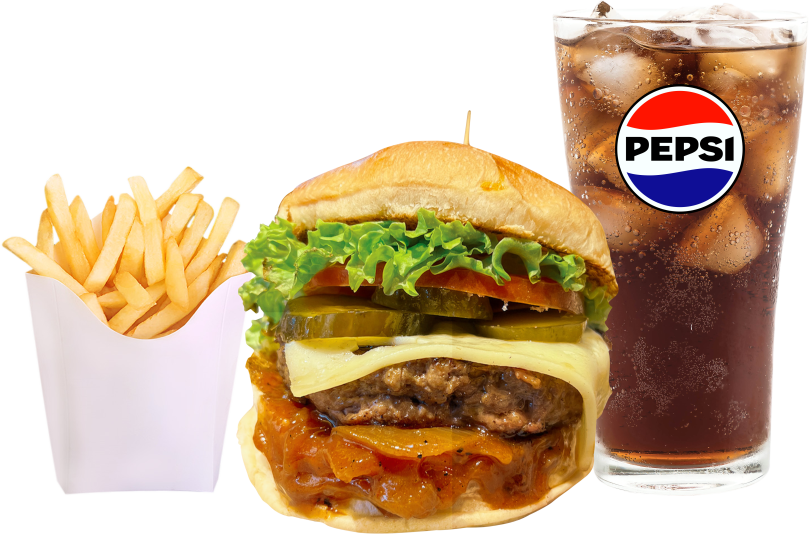 Pan de la casa, lechuga, tomate, cebolla morada, carne 150 g, 2 quesos cheddar, mayonesa, kétchup, papas a la francesa y bebida (según disponibilidad).