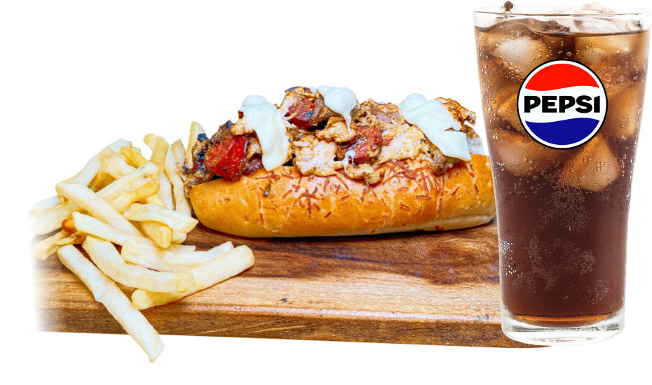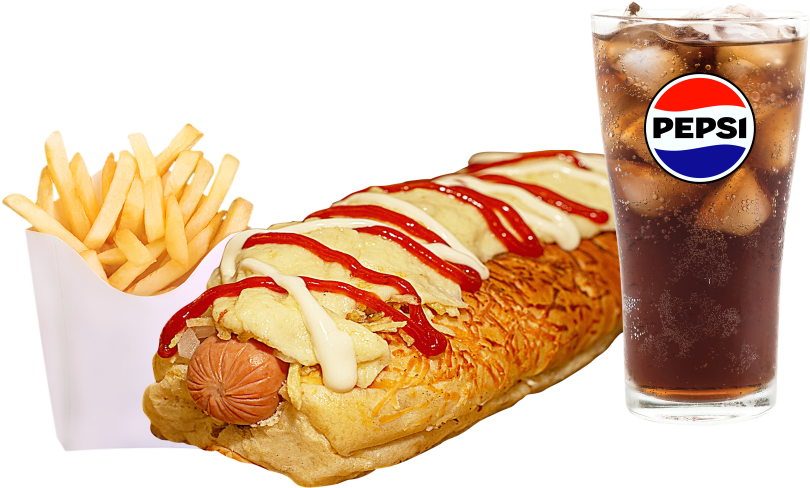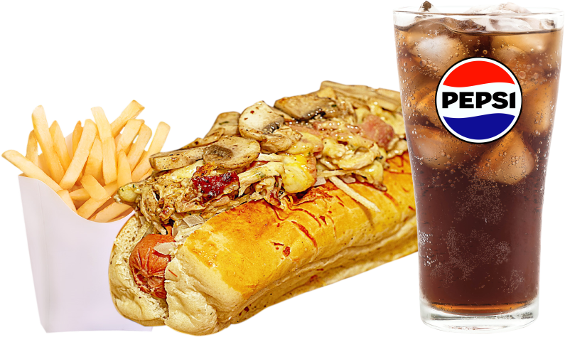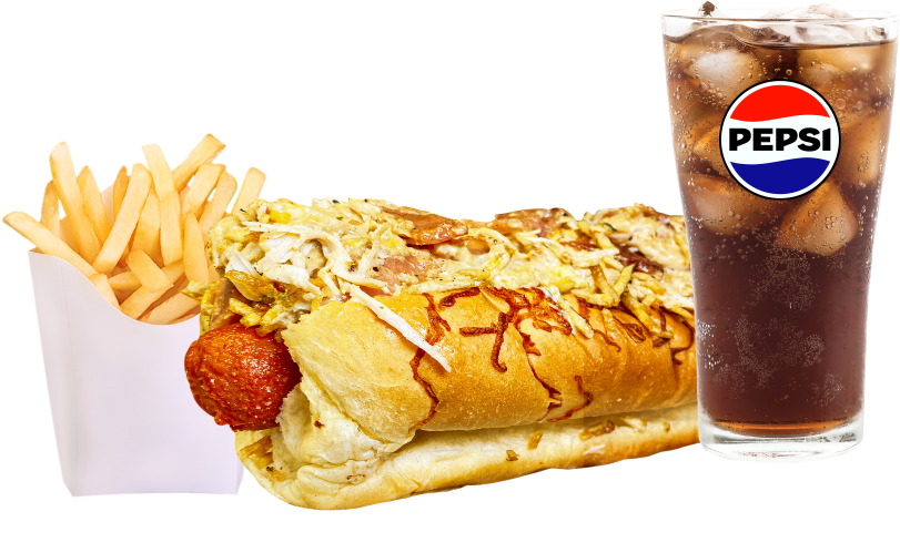 Pan de perro de la casa, salchicha americana Zenú, carne en cuadritos, pollo desmenuzado, bañado en salsa de la casa, chorizo, doble queso, cebolla grillé, incluye papa a la francesa y bebida (según disponibilidad).