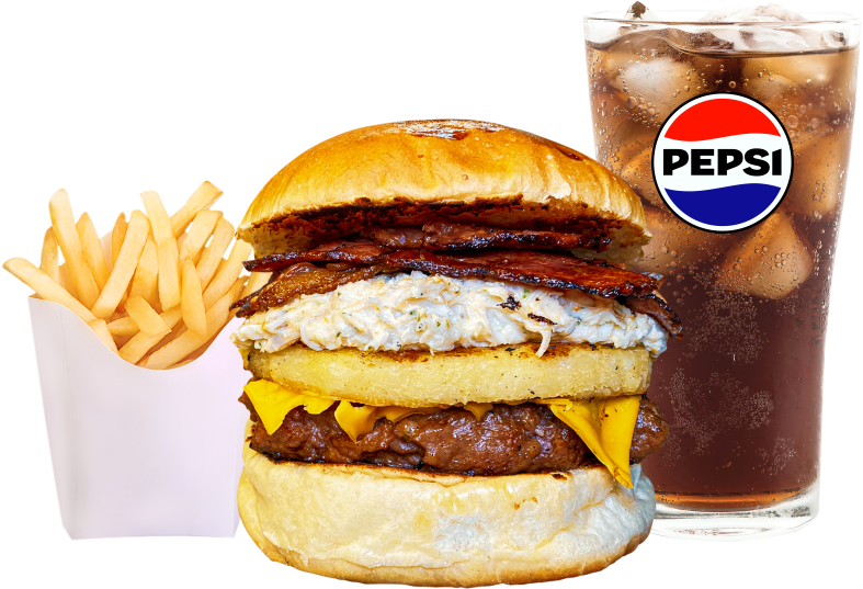 Hamburguesa de angus 180 g, queso cheddar, arepa con queso mozzarella, pollo desmenuzado, tocineta, salsa BBQ, incluye papa a la francesa y bebida (según disponibilidad).