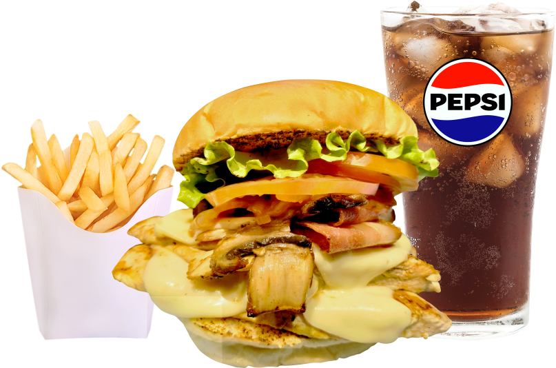 Hamburguesa con filete de pollo a la plancha 200 g, champiñones, doble queso mozzarella, lechuga, tomate, tocineta ahumada 50 g, kétchup, mostaza, tártara de la casa, incluye papa a la francesa y bebida (según disponibilidad).