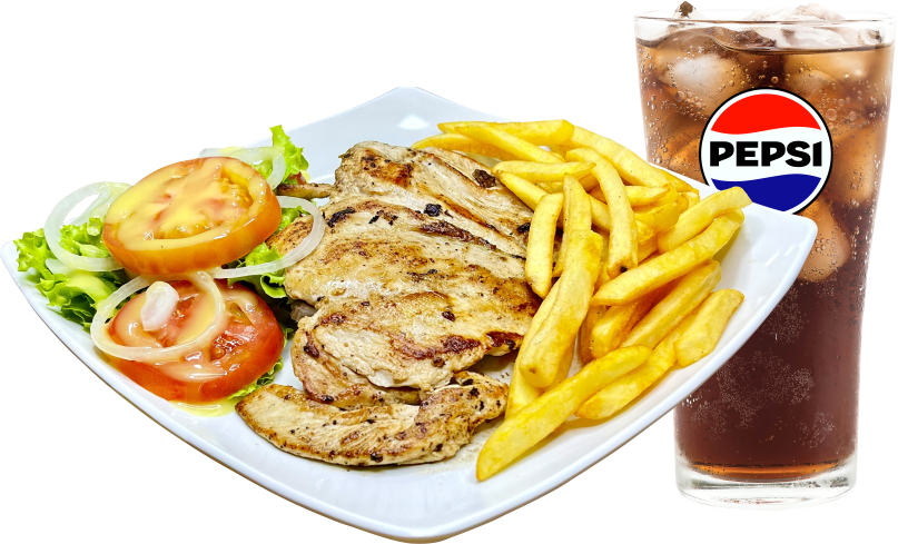 Filete de pechuga, papas a la francesa, ensalada y bebida (según disponibilidad).