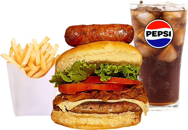Hamburguesa con carne de res, lechuga, tomate, cebolla, queso mozzarella, salsa de tomate, mayonesa, incluye papas a la francesa y bebida (según disponibilidad).