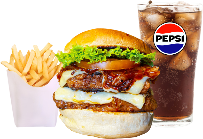 Hamburguesa con lechuga, tomate, cebolla grillé, dos carnes de 150 g, doble queso mozzarella, salsa de tomate, mayonesa, incluye papa a la francesa más bebida (según disponibilidad).