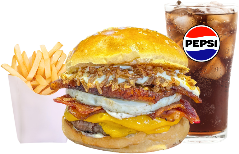 Hamburguesa doble carne angus, doble queso, tomate verde, cebolla cabezona, tocineta, huevo frito, incluye papa francesa y bebida (según disponibilidad).