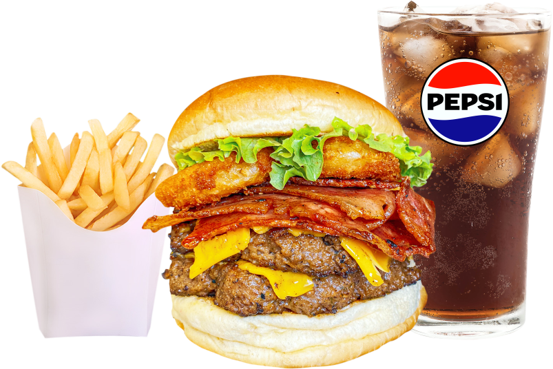Hamburguesa de dos carnes de 150 g, tres lonjas de queso cheddar, lechuga, tocineta, kétchup, mostaza, tártara de la casa, incluye papa a la francesa y bebida (según disponibilidad).
