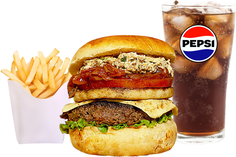 Hamburguesa con lechuga, tomate, cebolla grillé, dos carnes angus, doble queso mozzarella, salsa de tomate, mayonesa, incluye papa a la francesa más bebida (según disponibilidad).