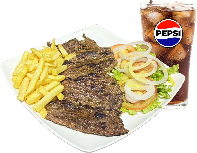 Corte de carne 350 g, papas a la francesa, ensalada más bebida (según disponibilidad).