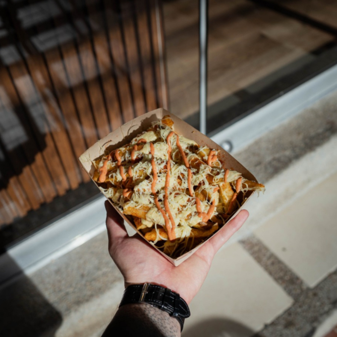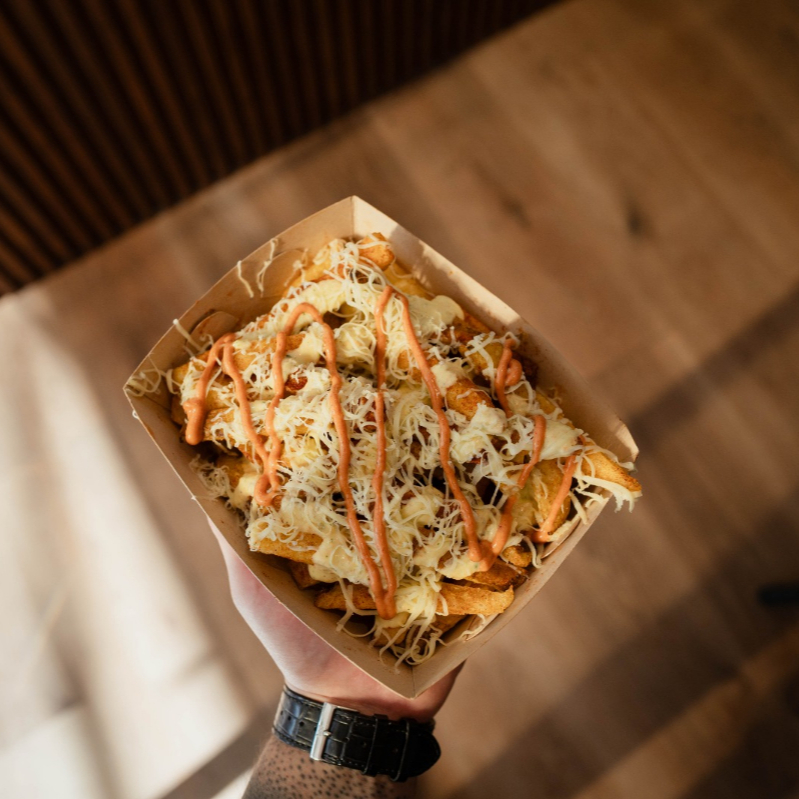 300 g De papas, bañadas en salsa preparada con sriracha y jalapeños.