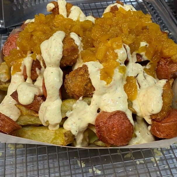 300 gr de papa a la francesa, con salchicha americana, trozos de pechuga apanado, salsa tarta y salsa de piña
