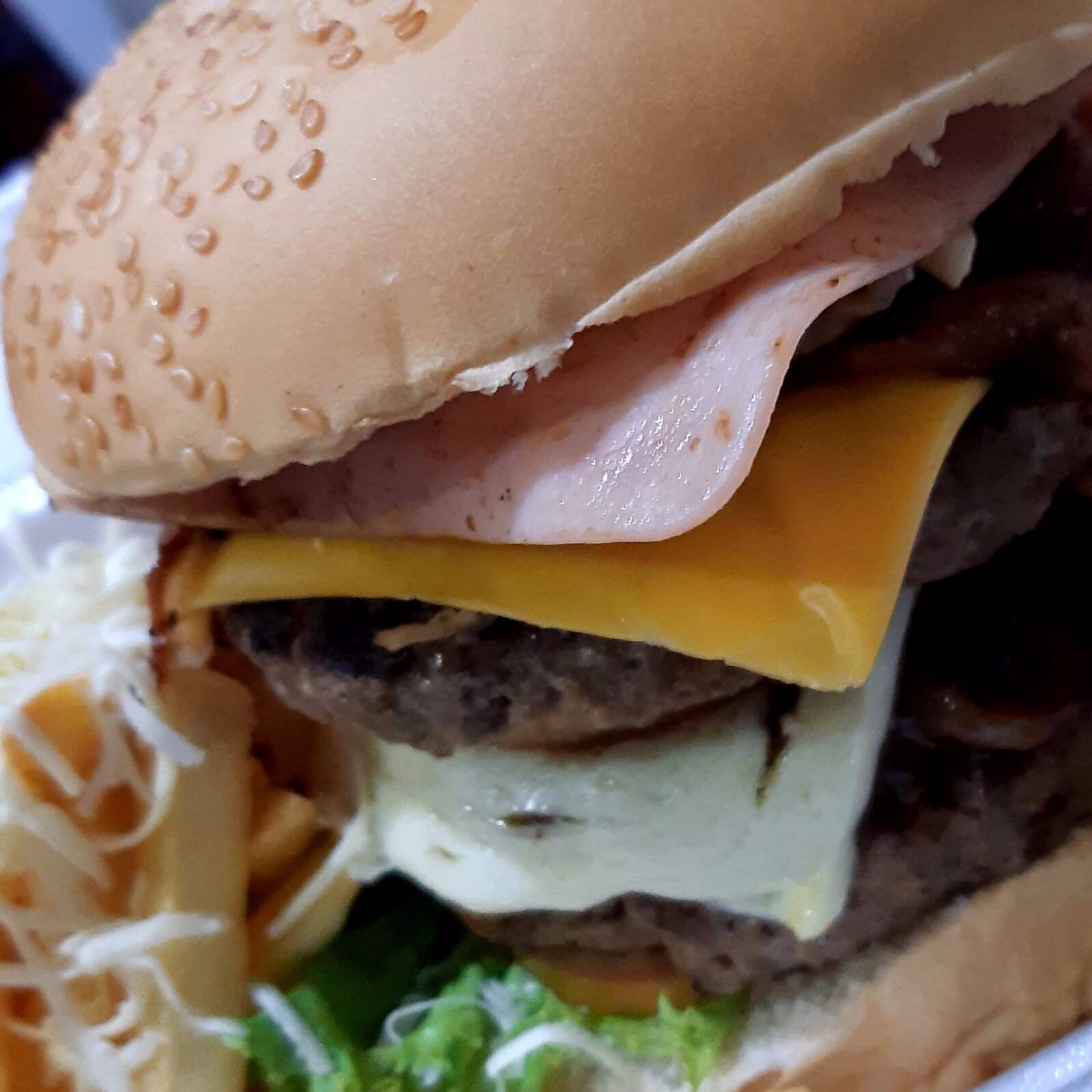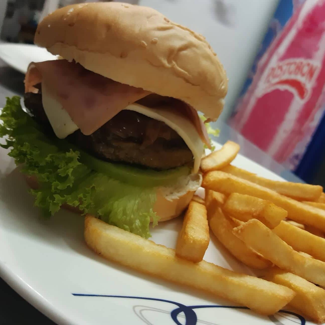 Doble carne, cebolla grillé, arepa, lechuga, tomate, jamón, queso, papa a la francesa.