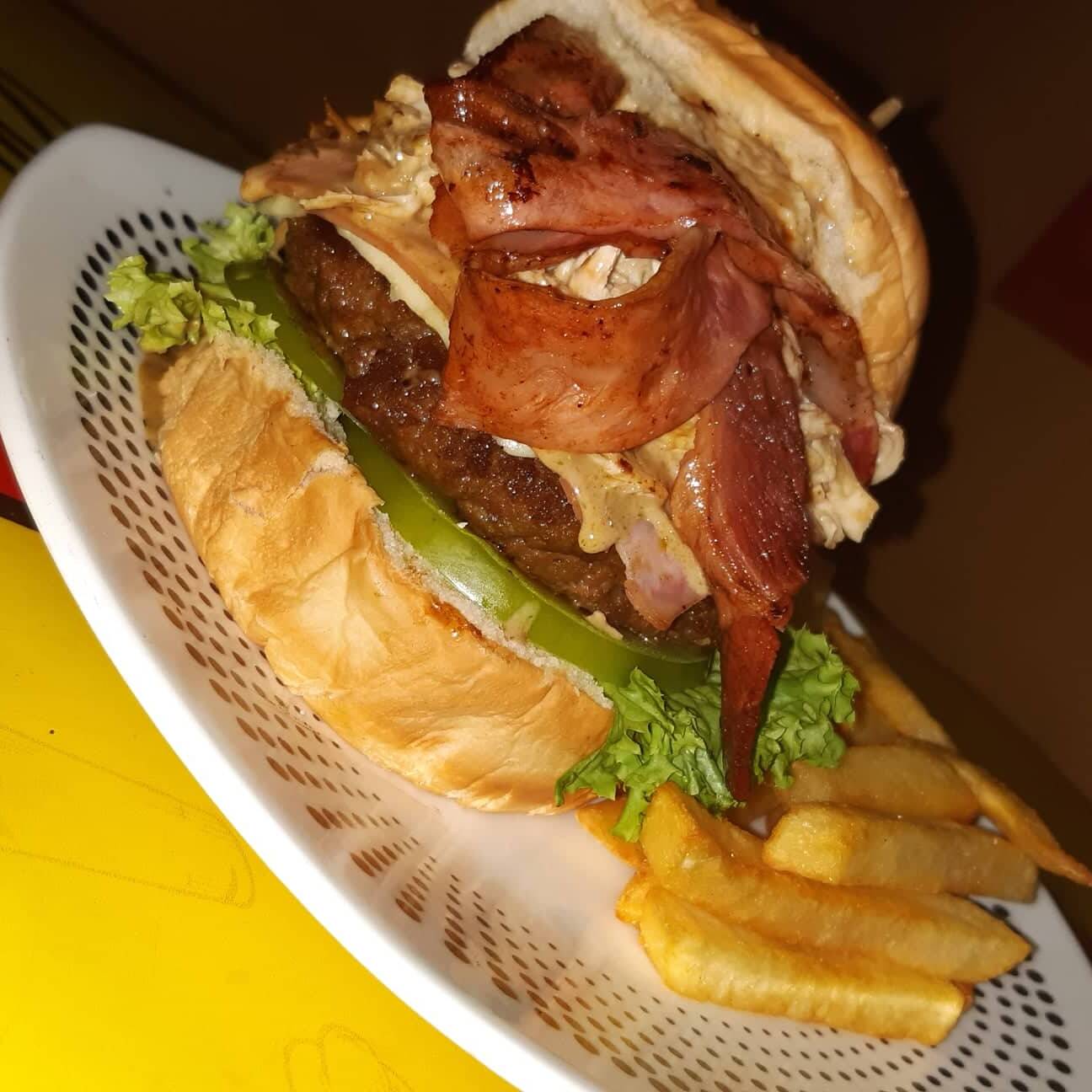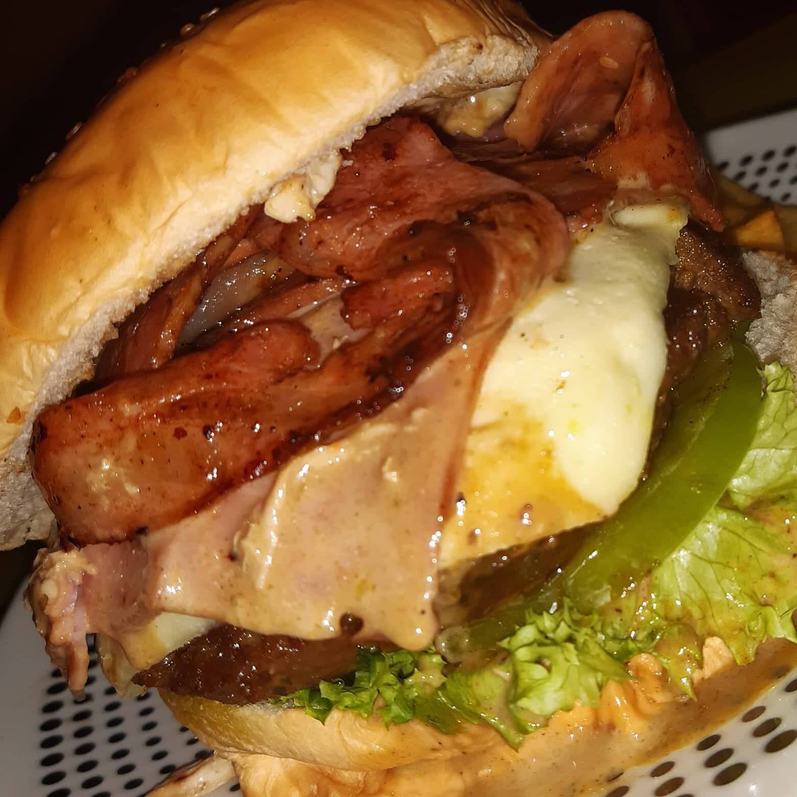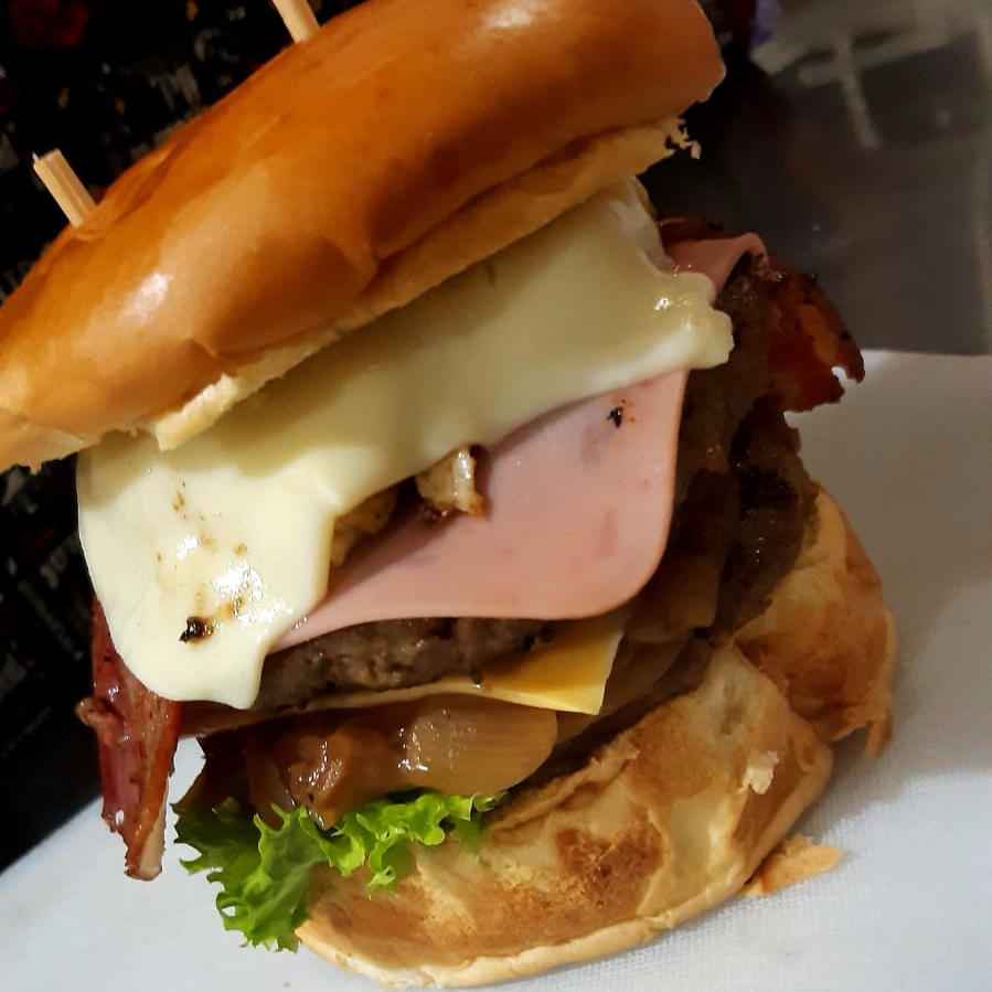 Carne, doble tocineta, cebolla grillé, arepa, lechuga, tomate, jamón, queso, papa a la francesa.