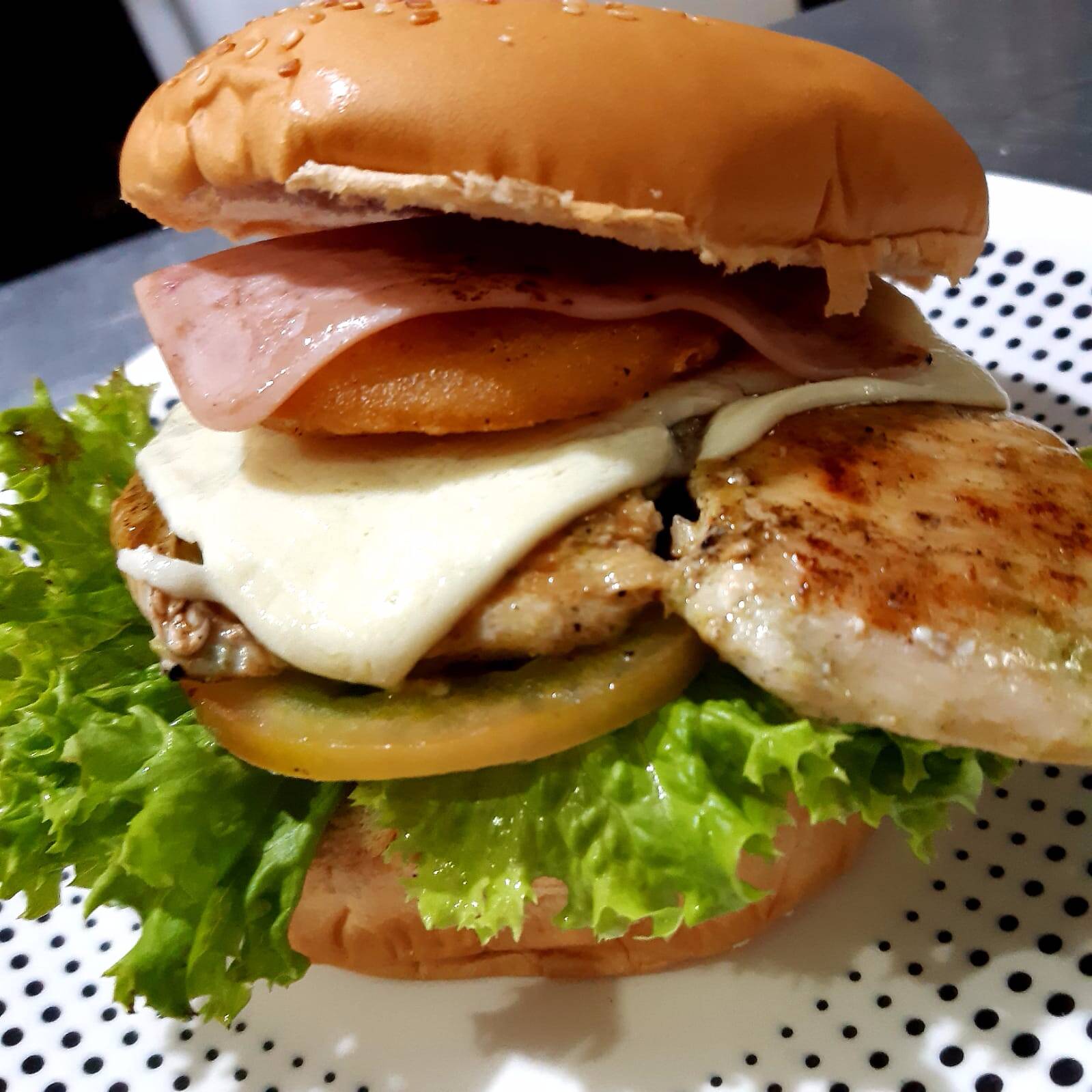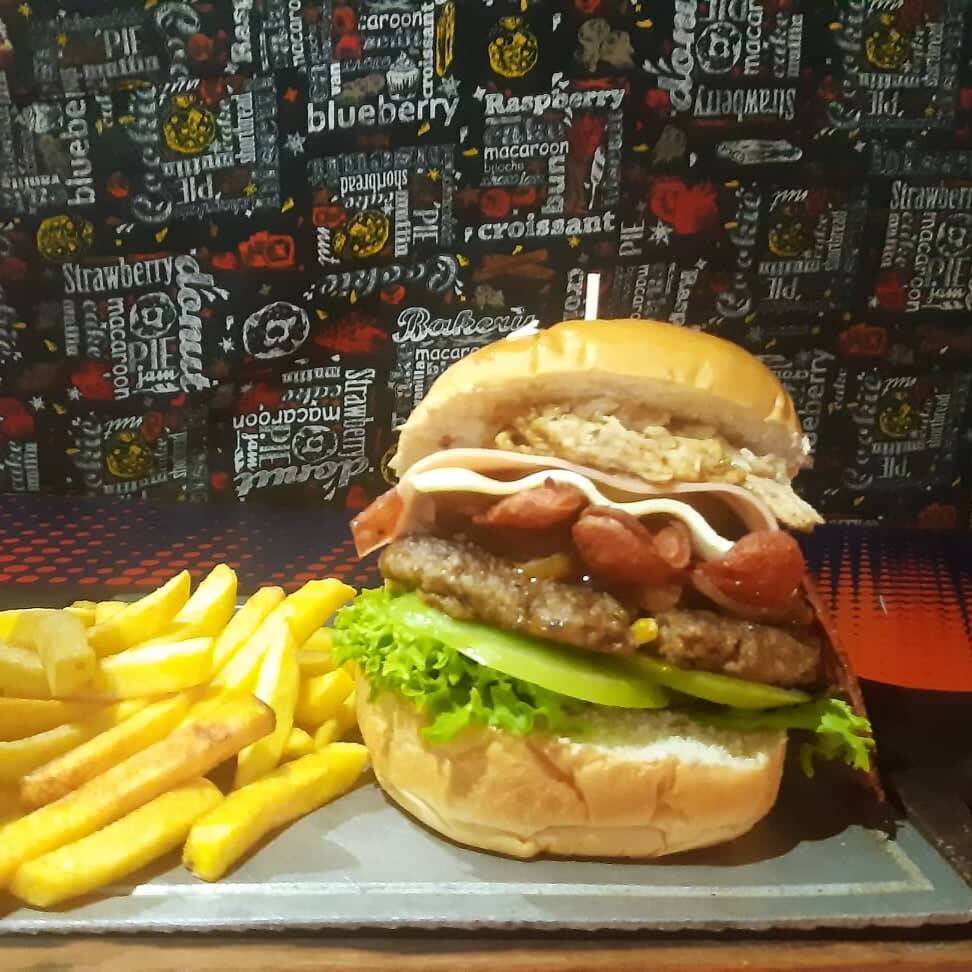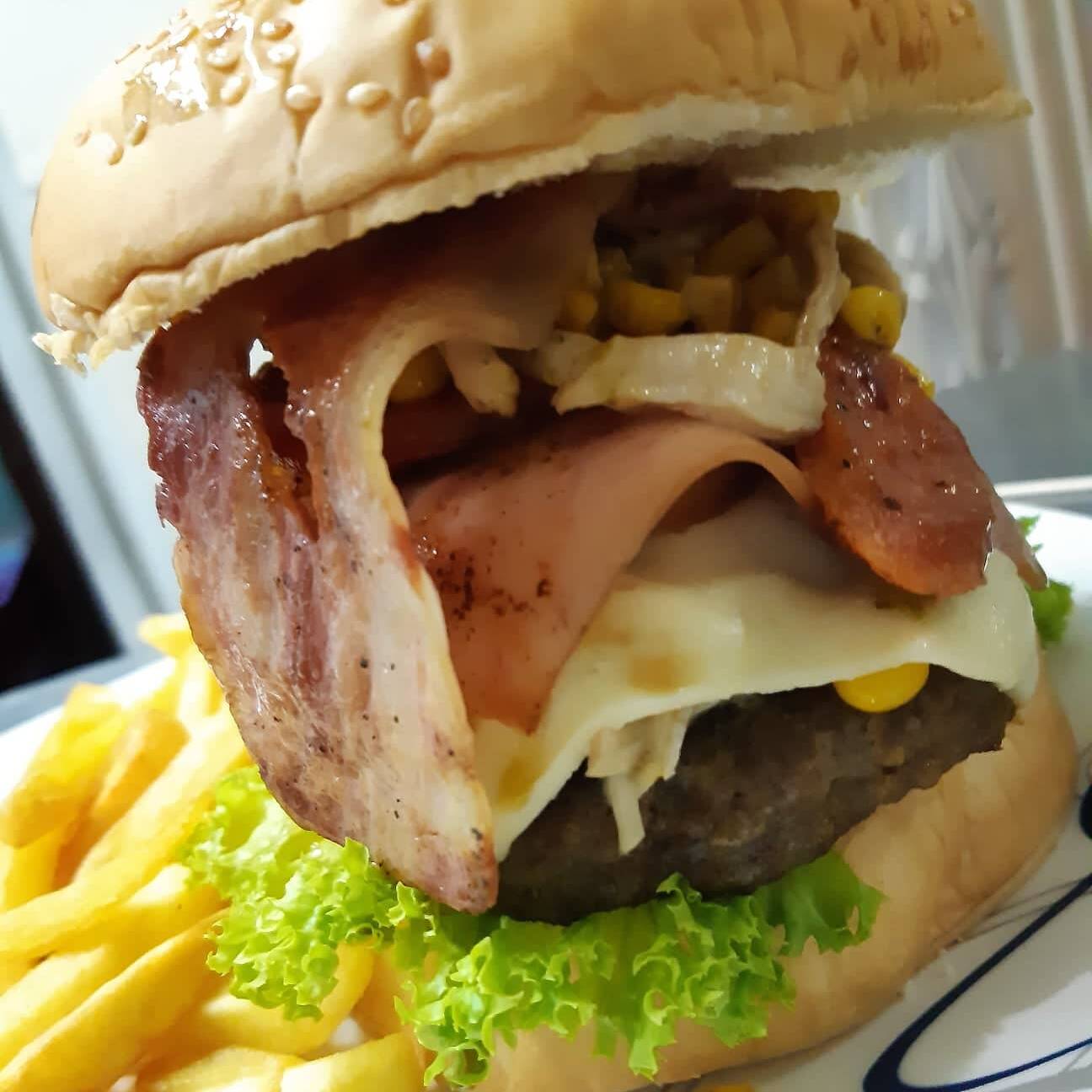 Carne, doble tocineta, cebolla grillé, arepa, lechuga, tomate, jamón, queso, papa a la francesa.
