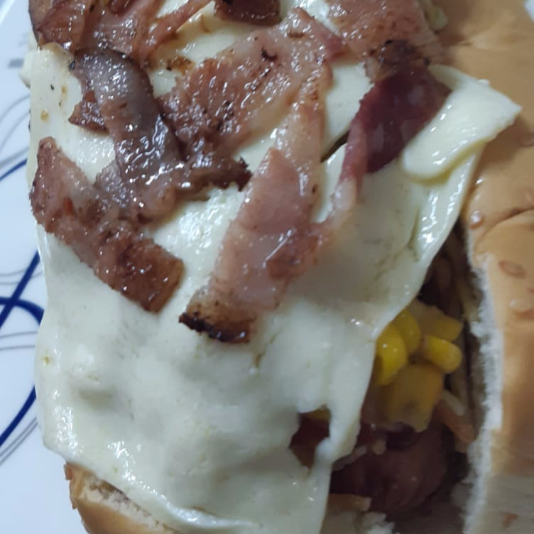 Salchicha tipo americana, cebolla grillé, tocineta, queso gratinado, maíz tierno desgranado, papa a la francesa.