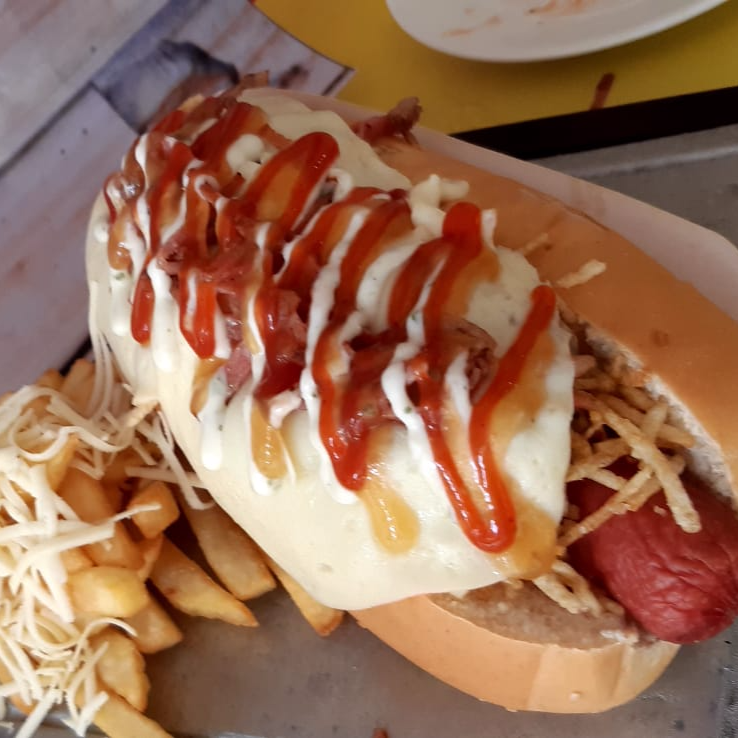 Salchicha tipo americana, pollo desmechado, tocineta, cebolla grillé, queso gratinado, papa a la francesa.