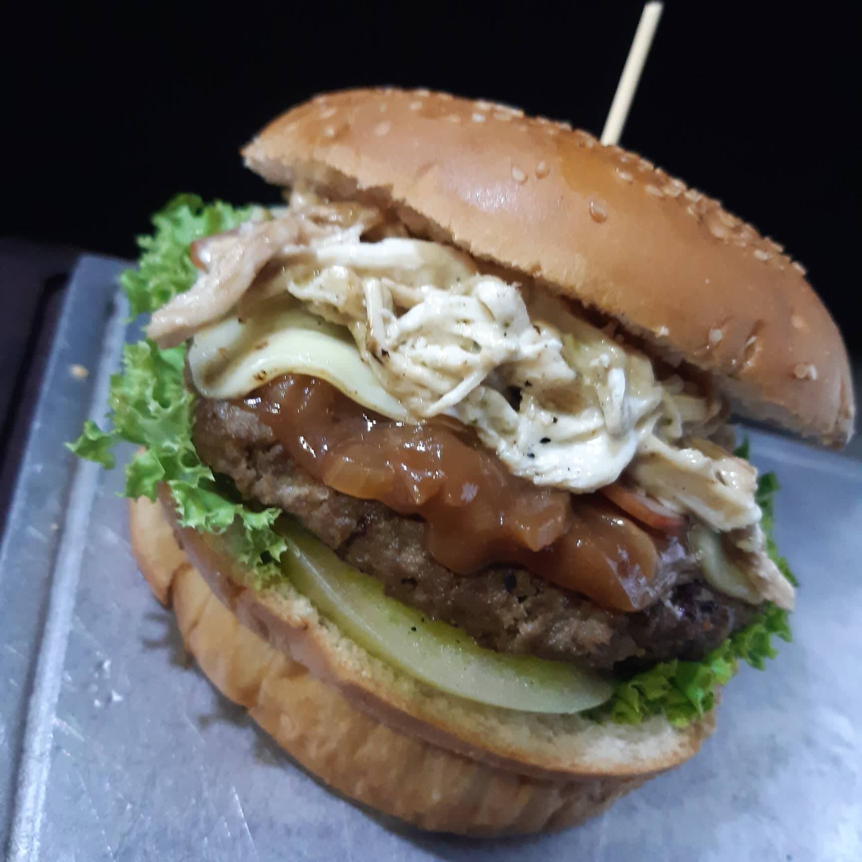 Doble carne, pollo desmechado en salsa de chorizo, cebolla dulce, arepa, tocineta, queso americano, queso blanco, jamón, tomate, lechuga y papas a la francesa.