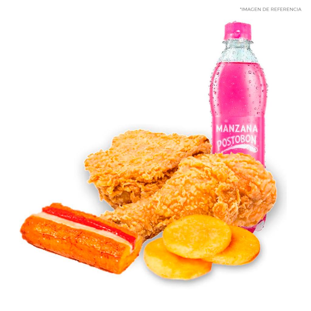 2 presas broaster + 3 arepas + 1 gaseosa Postobón pet 400 ml (sabor a disponibilidad)