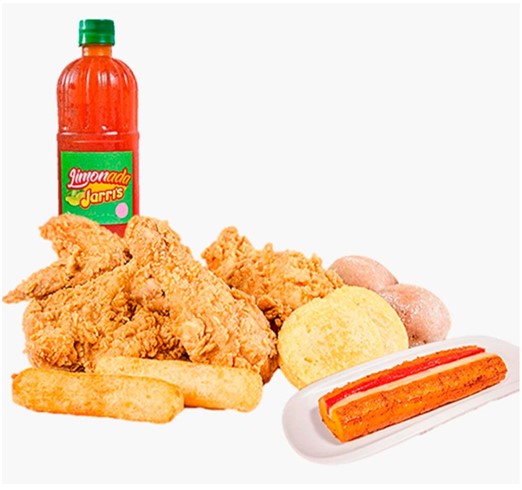 * 4 presas de pollo tradicional con papa, yuca frita y arepa * Gaseosa 1,5 L (sabor sujeto a disponibilidad) * 1 copa de la nueva salsa tártara Jarri’s 4 oz