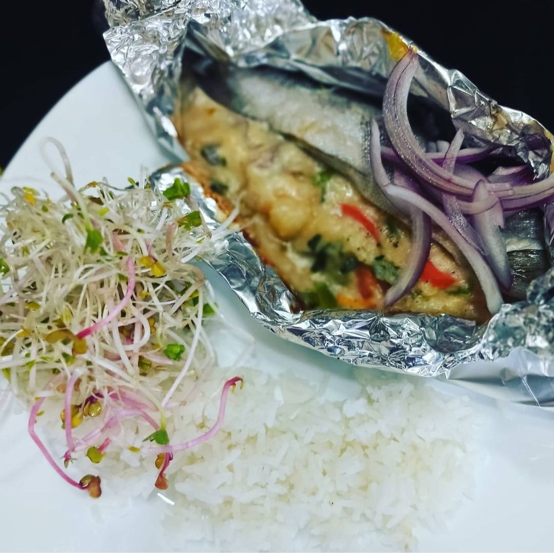 Mojarra de 300 g al papillote, arroz, ensalada, el papillote es una técnica de cocina que consiste en la cocción de un alimento en un envoltorio resistente al calor.