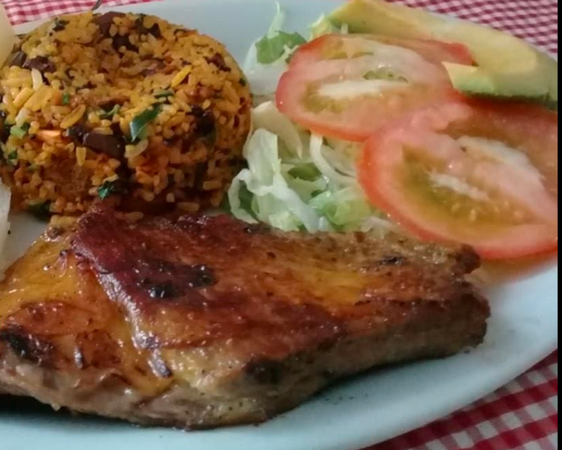 200 gr de lomo de cerdo al carbón o plancha, con yuca al vapor, arroz y ensalada.