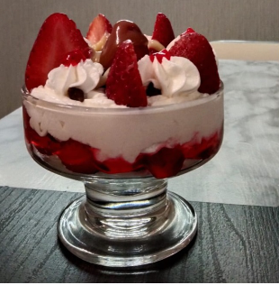 Combinación de frutas tropicales (manzana, fresa, mango y maracuyá) acompañado de un sabor de helado, crema chantilly y glasé de fresa.