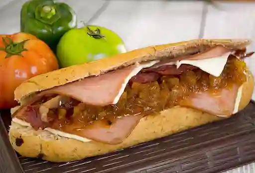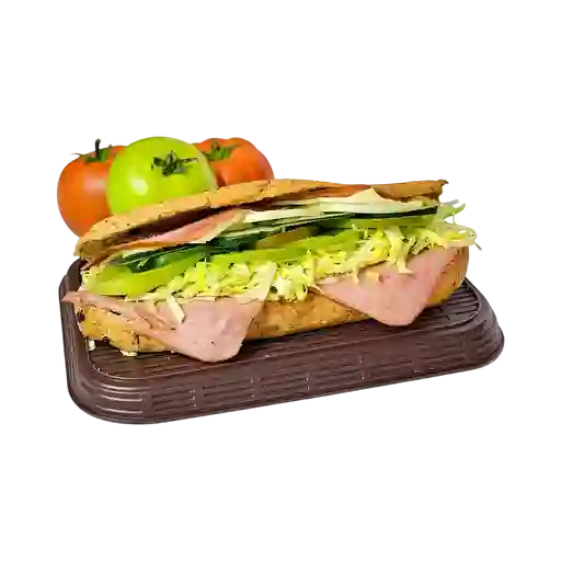 Sándwich jamón, queso doble crema, cabano, salami, maíz, verduras, salsa chipotle, BBQ, salsa ajo.