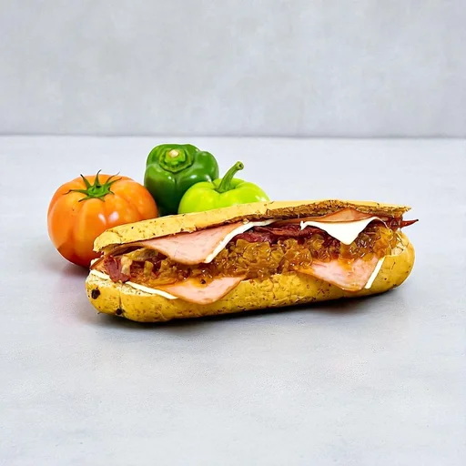 Sándwich jamón, queso doble crema, cabano, salami, maíz, verduras, salsa chipotle, BBQ, salsa ajo.