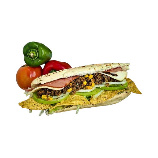 Sándwich carne, tocineta, maíz, jamón, queso, lechuga, tomate, cebolla, pimentón, BBQ, mostaza, ajo.