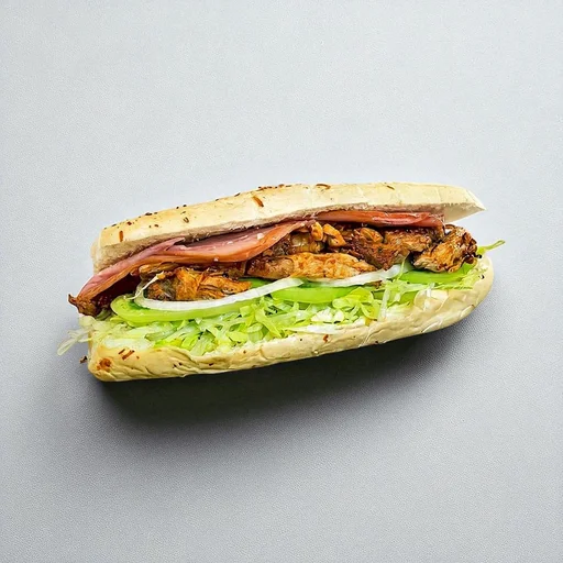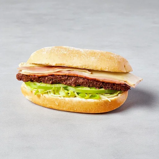 Apetitoso roast beef, jamón, lechuga, tomate, cebolla, pepinillos agridulces, queso cheddar.