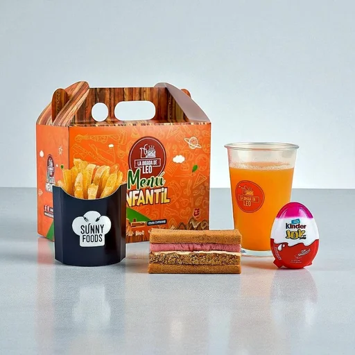 Sándwich de jamón, queso y milanesa de pollo crispy, salsa miel mostaza, papitas fritas, granizado y premio sorpresa.