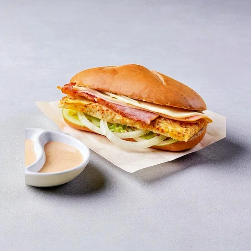 Sándwich pollo apanado, jamón, tocineta, queso, lechuga, tomate, cebolla, miel mostaza, salsa ajo.