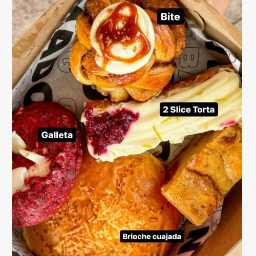 2 Porciones de torta, 1 bite, 1 galleta, 1 brioche de cuajada .