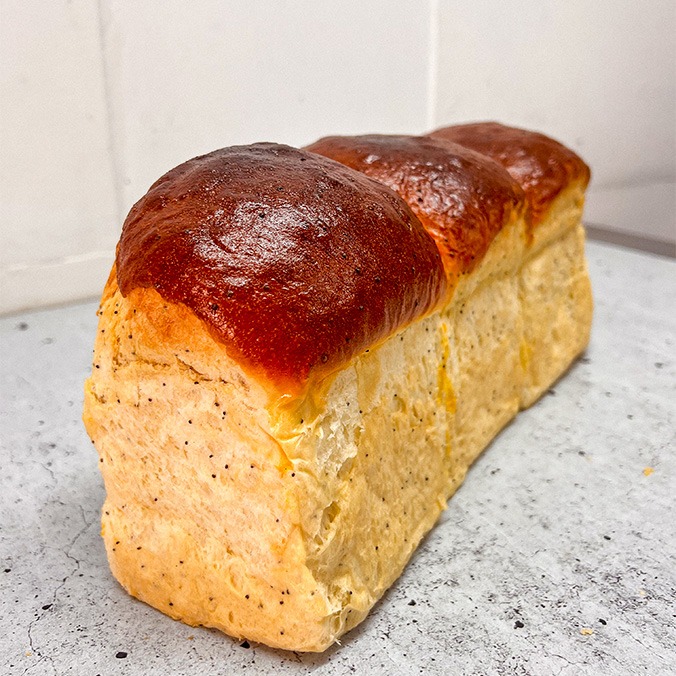 Pan suave y esponjoso, con un delicado toque de semillas de amapola.