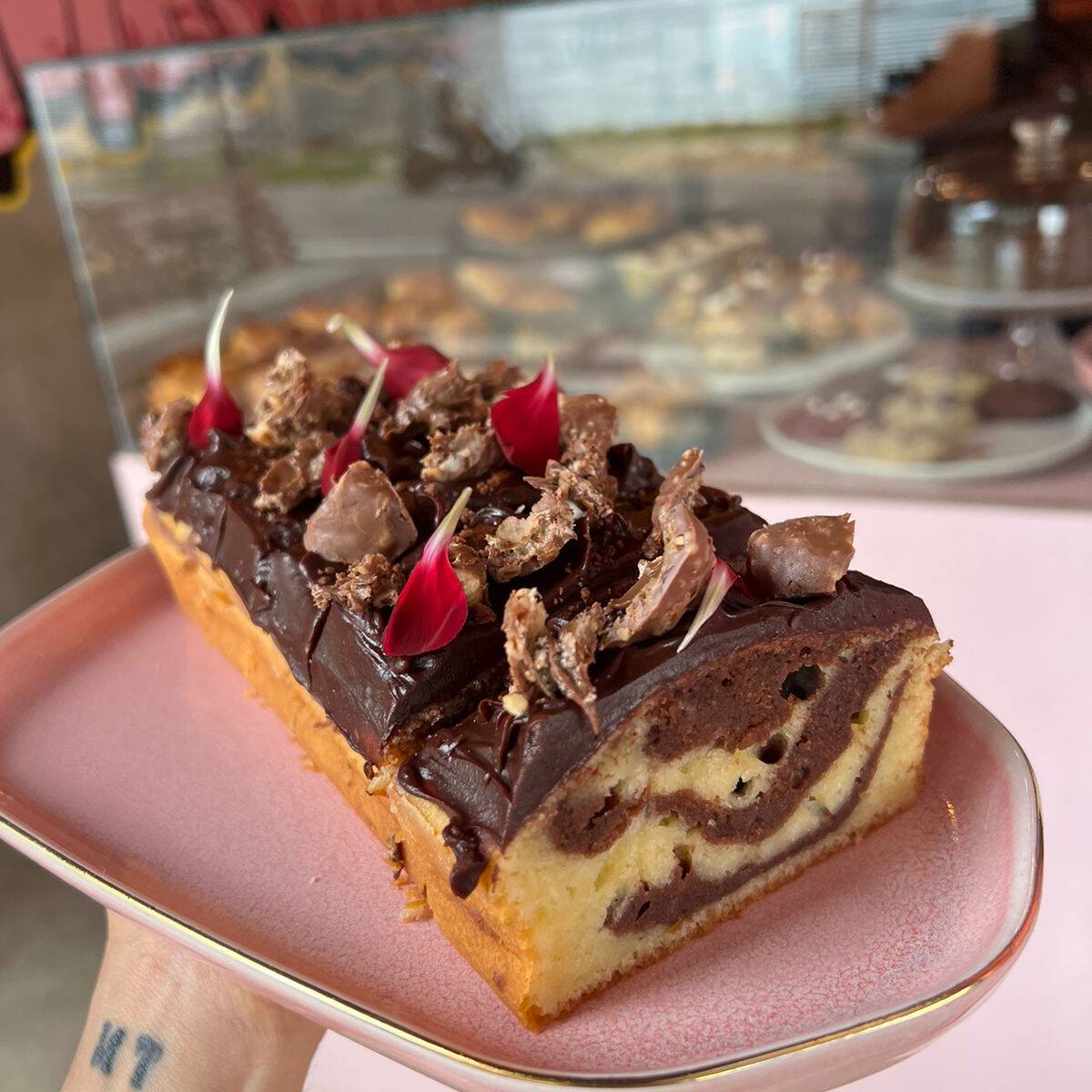 Torta marmoleada con cubierta de chocolate y trozos de ferrero.