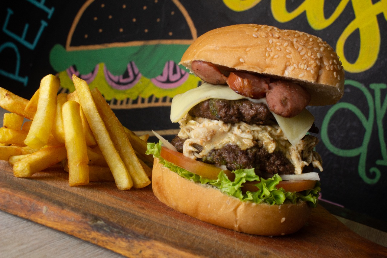 Pan brioche, lechuga, tomate, carne, chorizo, tocineta BBQ o mayo pimentón y papas a la francesa.