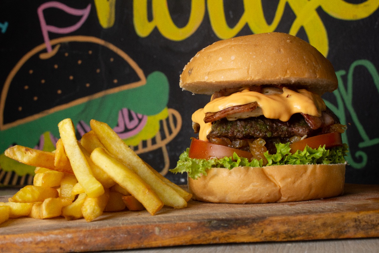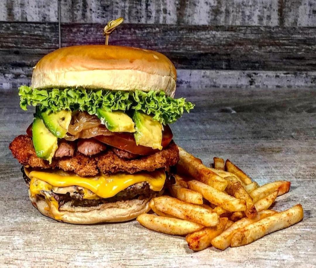 Pan brioche, lechuga, tomate, carne, cebolla crunch , tocineta BBQ o mayo pimentón y papas a la francesa.a