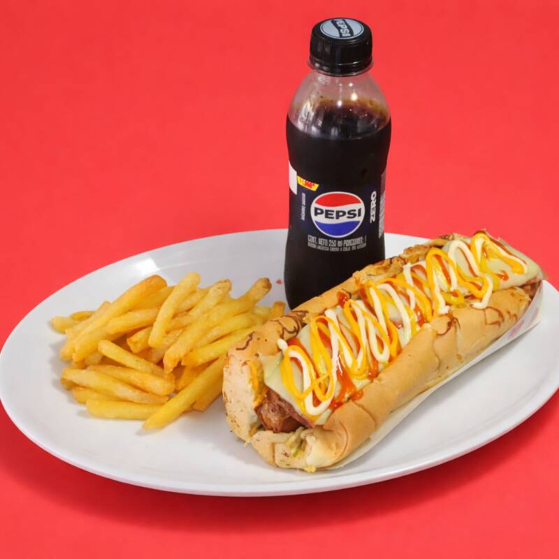 Pan de Perro, Chorizo, Jamón, Queso, Papa Ripio + Papas Francesas + Pepsi pet 250 Ml