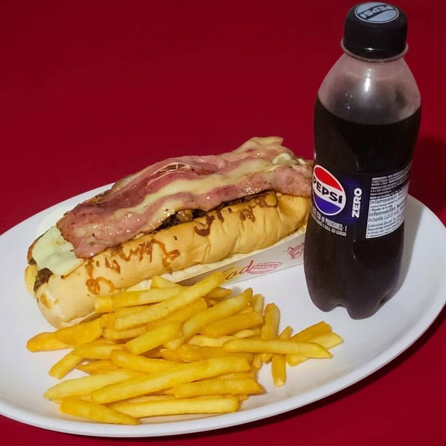 Pan de Perro, Carne, Pollo, Queso, Tocineta, Papa Ripio + Porción de Papas Francesas + Gaseosa pet 200Ml