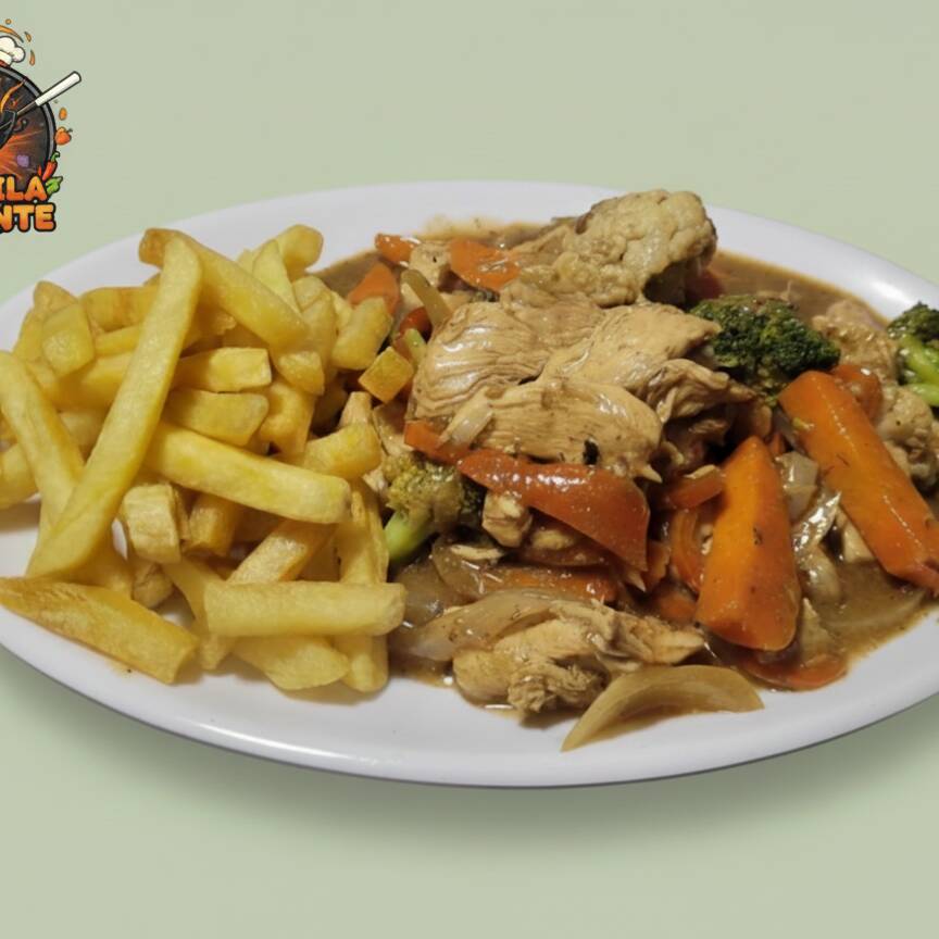 Pollo, Vegetales, Arroz chino, Papas Francesas.