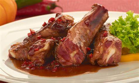 Costillas de cerdo 200 g acompañadas de arroz, papa o yuca al vapor y ensalada.