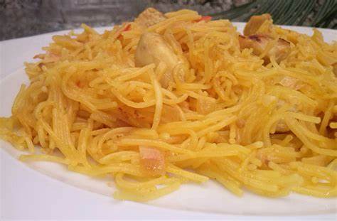 Almuerzo corriente con sopa de arroz con gallina, principio espaguettis, acompañada de papas al vapor.