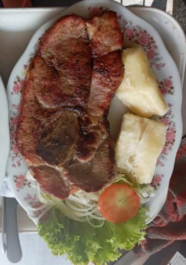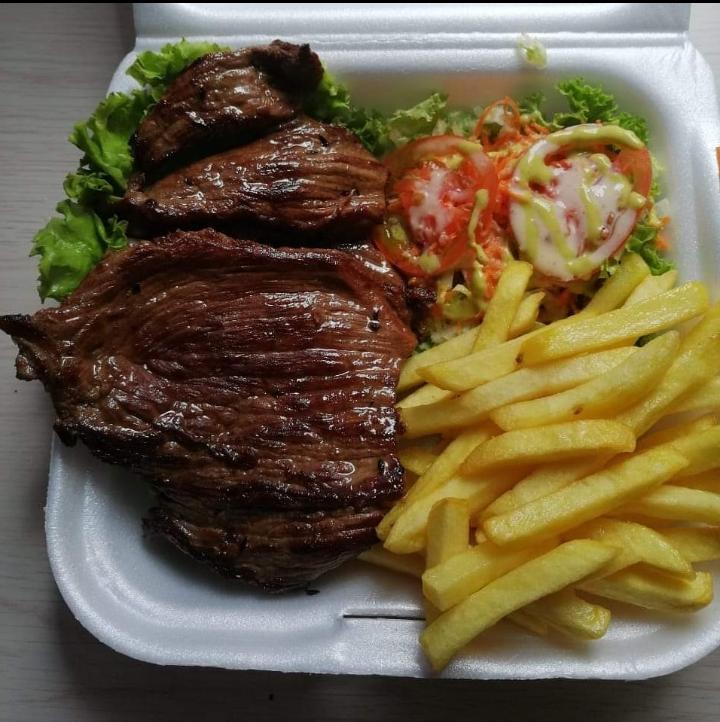 Carne chatas 200 g acompañada de arroz, yuca o papa al vapor ensalada.