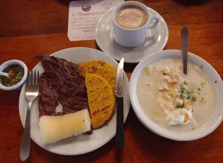 Caldo de Huevo, Arepa y Carne