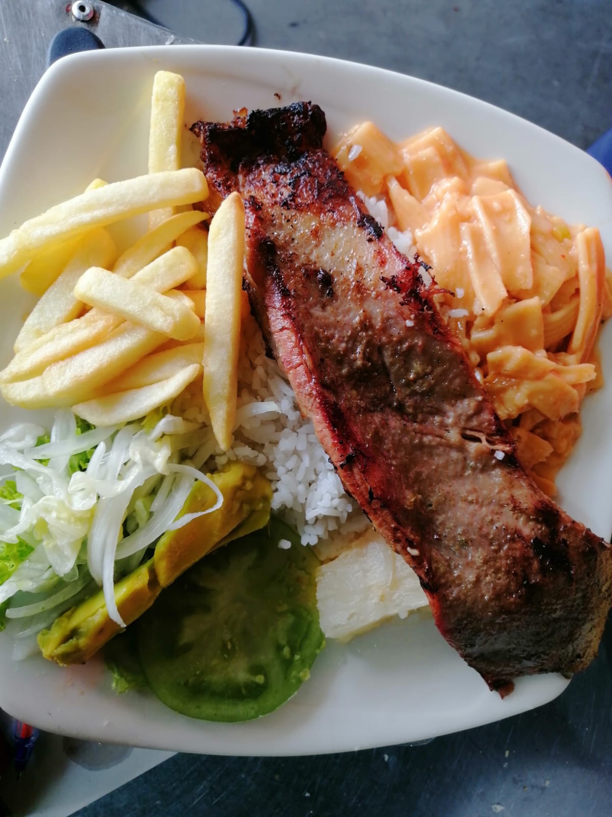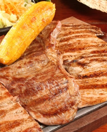 130 g De carne, chorizo acompañado de arroz y yuca.