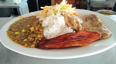 Almuerzo del día con sopa de arroz, principio lentejas o espaguetis, arroz, maduro frito.
