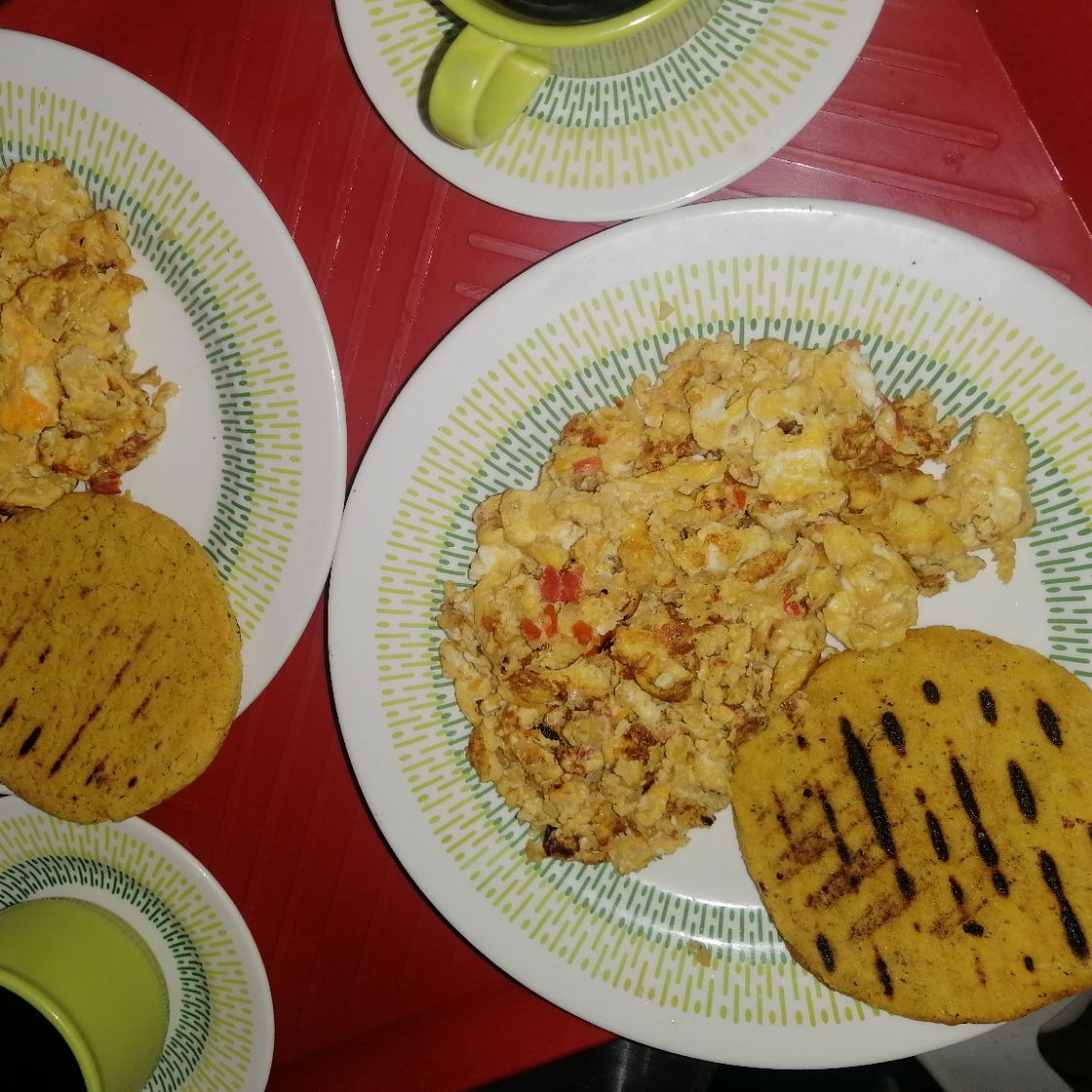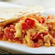 Huevos con cebolla, tomate, arepa blanca o amarilla, café o chocolate.