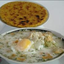 Caldo con huevos, leche, papa, cilantro, cebolla tostada, arepa blanca.
