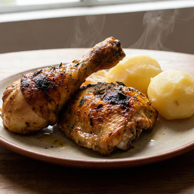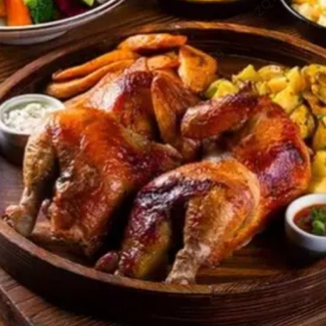 1/4 Pollo asado , acompado de papa a la francesa y sopa del día